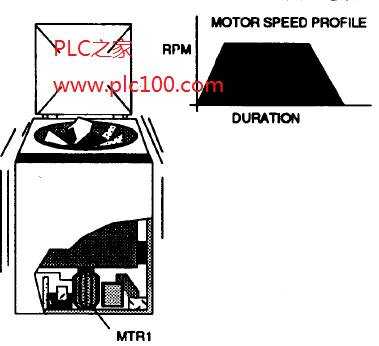 本節(jié)例子說(shuō)明了一臺(tái)洗衣機(jī)的電機(jī)速度是如何“提升”至額定轉(zhuǎn)速,在所要求時(shí)間里徠持這一速度,接著再返回至停止?fàn)顟B(tài)的。
