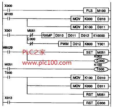 程序開(kāi)始運(yùn)行時(shí),應(yīng)給出一個(gè)瞬時(shí)輸出X013,以保證C000復(fù)位。接著應(yīng)該是輸入X000動(dòng)作,提供RAMP指令的初始參數(shù),再接下來(lái),輸入X001起作用,程序就完全被起動(dòng)。