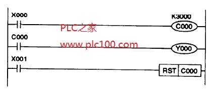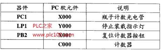 當(dāng)瓶子在傳送帶上移過(guò)來(lái)時(shí),它們擋住光電管PC1的光線(xiàn)。每次光線(xiàn)被檔住,代表PC1的輸入X000變?yōu)椤?/span>ON,程序起動(dòng)一個(gè)計(jì)數(shù)器。這里,C000用來(lái)“記錄”經(jīng)過(guò)PC1的瓶子數(shù)量。C000事先設(shè)定一個(gè)計(jì)數(shù)上限,這樣就能提供一天或一班次處理的瓶子總數(shù)。本例中上限定為30000。