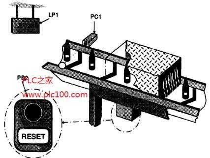 因?yàn)橛?jì)數(shù)器要保存它的數(shù)據(jù),所以需要一種復(fù)位當(dāng)前計(jì)數(shù)值的方法,可以用“復(fù)位”按鈕PB2實(shí)現(xiàn)。PB2對(duì)應(yīng)于輸入X001,它使計(jì)數(shù)器設(shè)定為Oo "STOP"燈關(guān)斷,整個(gè)系統(tǒng)準(zhǔn)備下一批3000個(gè)瓶子經(jīng)過(guò)。