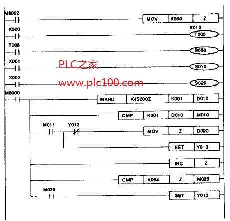 輸入X000至X002激活三個(gè)錯(cuò)誤。輸入有效時(shí),表示錯(cuò)誤存在。當(dāng)一個(gè)錯(cuò)誤出現(xiàn),如X001為ON時(shí),它的錯(cuò)誤號(hào)移入數(shù)據(jù)寄存器D020。這時(shí),D020會(huì)等于數(shù)字10(因?yàn)?/span>X000使標(biāo)志SO10有效)。為了確認(rèn)它作為一個(gè)當(dāng)前錯(cuò)誤,輸出Y013被設(shè)置為ON。這個(gè)輸出表現(xiàn)為脈沖或閃爍輸出,這是因?yàn)槊?/span>64次程序掃描,它被置位和復(fù)位一次。