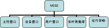 由MCGS生成的用戶應(yīng)用系統(tǒng),其結(jié)構(gòu)由主控窗口、設(shè)備窗口、用戶窗口、實(shí)時(shí)數(shù)據(jù)庫和運(yùn)行策略五部分組成。如下圖所示