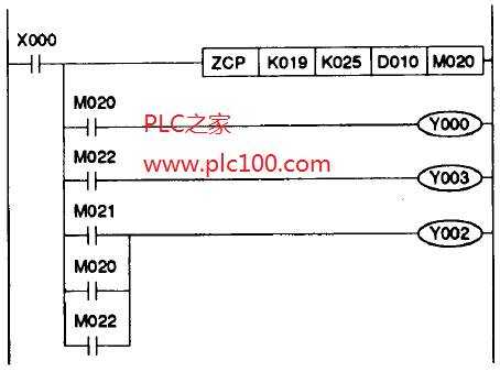 一個(gè)加熱控制系統(tǒng)要求當(dāng)前溫度對(duì)照一個(gè)溫度范圍來(lái)校核,此范圍規(guī)定了一個(gè)周?chē)ぷ鳝h(huán)境。本例將存儲(chǔ)在D010中的溫度值,由調(diào)溫器THR1讀出,與K19和K25作比較。這溫度范圍表示一個(gè)舒適的辦工環(huán)境。做完比較,必須有一個(gè)結(jié)果,這個(gè)結(jié)果經(jīng)比較得到3個(gè)主要狀態(tài),即>、=、<。這3個(gè)狀態(tài)可用位標(biāo)志表示,本例中使用了M20到M22。