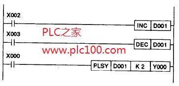脈沖頻率的這種變化通過(guò)增大或減小數(shù)據(jù)寄存器的值來(lái)完成,本例中的寄存器為D001。實(shí)現(xiàn)方法是:連接輸入X002 (PB2)到INC指令,輸入X003 (PB2)到DEC指令,程序每次掃描時(shí),這些指令使數(shù)據(jù)寄存器的內(nèi)容加1或減1。