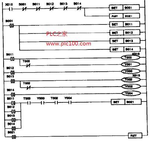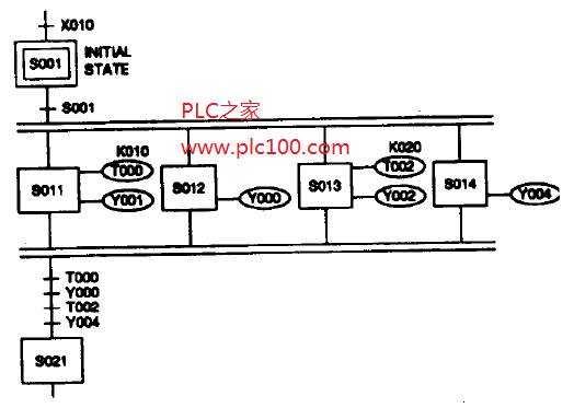 用來(lái)同時(shí)起動(dòng)所有任務(wù)的方法叫做并行分支(圖中表示為并行水平線)o STL程序圖顯示,一旦唯一的條件S001滿足,狀態(tài)S011, S012, S013和S014就都被激活。