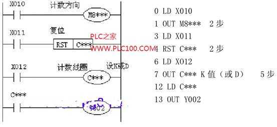 當(dāng)X010為ON時(shí),對(duì)應(yīng)C***的M8***也ON,這時(shí)C***為減計(jì)數(shù)。