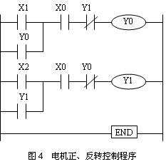 圖4為電機正反轉(zhuǎn)控制程序,采用自鎖和互鎖控制程序。也可以采用SET和RST指令來實現(xiàn)。