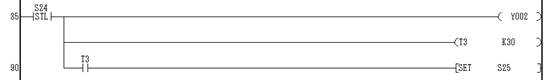 狀態(tài)轉(zhuǎn)移到S24,起動(dòng)Y02(電機(jī)正轉(zhuǎn)),T3計(jì)時(shí)3秒.計(jì)時(shí)完畢狀態(tài)轉(zhuǎn)移到S25.正轉(zhuǎn)完畢.
