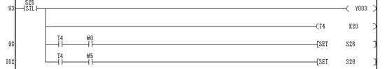 狀態(tài)轉(zhuǎn)移到S25,起動(dòng)Y03(電機(jī)反轉(zhuǎn)),T4計(jì)時(shí)2秒.