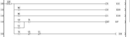 如果選擇的是簡(jiǎn)單程序(按X05),那么C1計(jì)數(shù),當(dāng)計(jì)數(shù)不夠100次時(shí),狀態(tài)轉(zhuǎn)移到S24.計(jì)數(shù)滿100次時(shí),狀態(tài)轉(zhuǎn)移到S27.