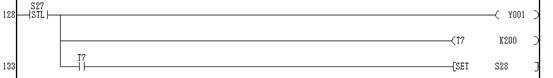 狀態(tài)轉(zhuǎn)移到S27,起動(dòng)Y01(排水).T7計(jì)時(shí)20秒,然后T7置1,狀態(tài)轉(zhuǎn)移到S28.