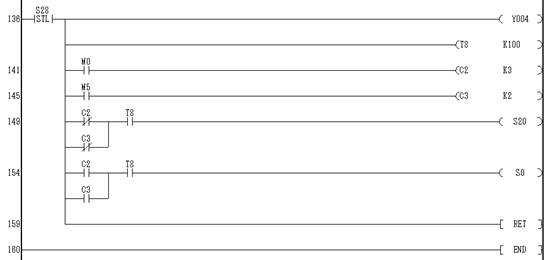 如果選擇的是簡(jiǎn)單程序(按X05),那么C3計(jì)數(shù),當(dāng)計(jì)數(shù)不夠2次時(shí),狀態(tài)轉(zhuǎn)移到S20.計(jì)數(shù)滿2次時(shí),狀態(tài)轉(zhuǎn)移到S0.