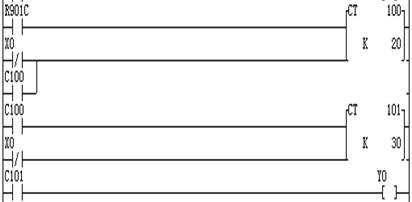 圖4-49是由兩個計數(shù)器組成的延時電路。輸入Ⅹ0端接通后,CT100開始對R901C(1s時鐘脈沖)進行減計數(shù)。經(jīng)過20s,CT100有輸出,其常開觸點C100閉合。CT101對C100常開觸點的動作計數(shù)一次。與此同時C100常開觸點也將CT100復(fù)位,C100常開觸點又斷開,CT100繼續(xù)對R901C計數(shù)。又經(jīng)過20s,CT101又對C100常開觸點計數(shù)一次……。如此循環(huán),經(jīng)過20s×30=600s后,CT101有輸出,其常開觸點C101閉合,接通輸出繼電器Y0。