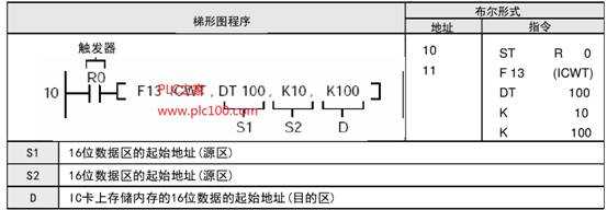 當(dāng)觸發(fā)器R0為ON時(shí),將存儲(chǔ)在DT100~DT109中的10個(gè)字的數(shù)據(jù)傳輸?shù)?/span>IC卡中的擴(kuò)展存儲(chǔ)區(qū)。