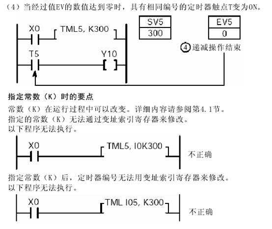 在程序處理過(guò)程中定時(shí)器值遞減,應(yīng)編寫(xiě)程序使一個(gè)掃描周期內(nèi)執(zhí)行一次遞減(如果使用了中斷程序或JP/LOOP等指令,使得程序在一個(gè)掃描周期內(nèi)沒(méi)有處理或產(chǎn)生多次出來(lái),則不能得到正確的結(jié)果。)如果需要在一個(gè)掃描周期內(nèi)進(jìn)行多重處理,請(qǐng)參照系統(tǒng)寄存器4.在將定時(shí)器指令與ANS指令或POPS指令組合使用時(shí),請(qǐng)注意表達(dá)式的正確性。