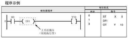 當(dāng)PLC模式改為運(yùn)行(RUN)、或PLC在運(yùn)行模式下接通電源時(shí),如果此時(shí)觸發(fā)器(執(zhí)行條件)已經(jīng)閉合,則使用DF指令不能在第一個(gè)掃描周期產(chǎn)生輸出。因此,在此情況下應(yīng)使用DFI指令。