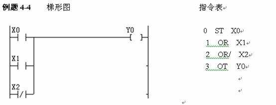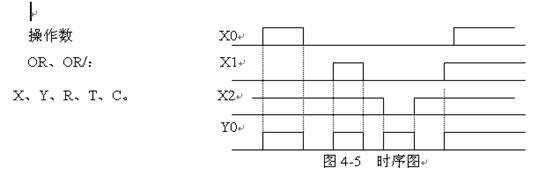 當(dāng)X0或X1接通或X2斷開時,Y0均受激。在程序中OR、OR/指令可連續(xù)使用多次。時序圖,如圖4-5所示。