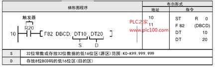 F82(DBCD)、P82(PDBCD)指令將32位二進(jìn)制數(shù)據(jù)轉(zhuǎn)換為表示8位十進(jìn)制數(shù)的BCD碼(8-digit)。