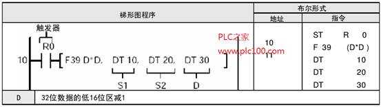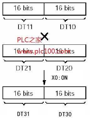 當(dāng)觸發(fā)器R0為ON時(shí),數(shù)據(jù)寄存于DT11和DT10的內(nèi)容與數(shù)據(jù)寄存器DT21和DT20的內(nèi)容相乘。乘積保存于數(shù)據(jù)寄存器DT31和DT30中。