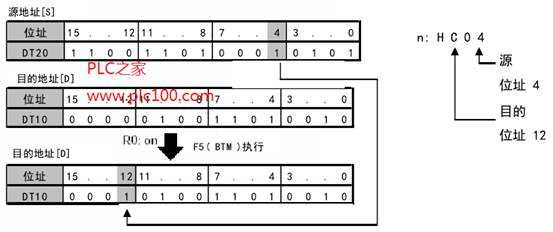 當(dāng)觸發(fā)器R0為ON時,數(shù)據(jù)寄存器DT20中的第4位的數(shù)據(jù)被復(fù)制到數(shù)據(jù)寄存器DT10中的第12位。