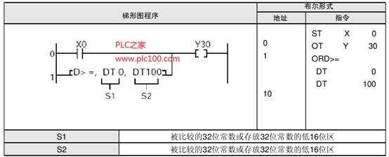 將數(shù)據(jù)寄存器(DT1, DT0)的內(nèi)容與數(shù)據(jù)寄存器(DT101, DT100)的內(nèi)容進(jìn)行比較。當(dāng)X0閉合或者(DT1, DT0)>=(DT101, DT100)時(shí),外部輸出繼電器Y30為ON。