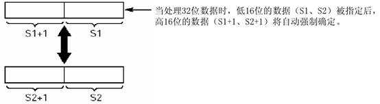 處理32位數(shù)字時(shí),指定低16位區(qū)(S1, S2)后,會(huì)自動(dòng)確定高16位區(qū)(s1+1, s2+1)。