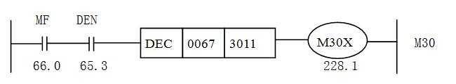 下面舉一個使用DEC指令的例子,這是M30的譯碼程序,M功能的兩位BCD碼信號地址是0067,圖2是M30的譯碼梯形圖,表1是圖2的編碼表。