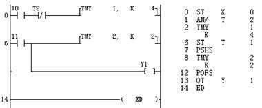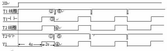X0接通T1線圈受激,延時4s后T1的常開觸點閉合,同時使T2、Y1線圈受激,Y1輸出。T2線圈受激2s后按如下順序產(chǎn)生一系列動作(注意與時序圖對應(yīng)著分析)。①T2常閉觸點斷開②使T1線圈失電,③ T1線圈失電又使T1常開觸點斷開進而導(dǎo)致④T2、Y1線圈同時失電, ⑤T2線圈失電使T2常閉復(fù)位,⑥下一個掃描周期,復(fù)位后的T2常閉觸點又使T1線圈受激,4s后T2、Y1線圈再次受激……。分析可見Y1產(chǎn)生了一個周期為6s的振蕩信號,時序如圖4-41所示。