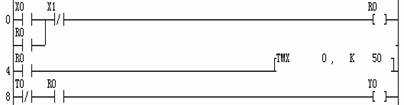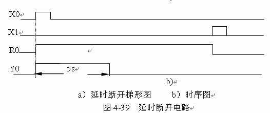 圖4-39是輸入Ⅹ0端接不帶自鎖按鈕的延時斷開電路梯形圖。當(dāng)輸入Ⅹ0端接通,內(nèi)部繼電器R0線圈接通,其常開觸點R0閉合使輸出Y0接通,同時定時器T0開始計時,延時5s后,T0常閉觸點打開,輸出Y0為OFF。
