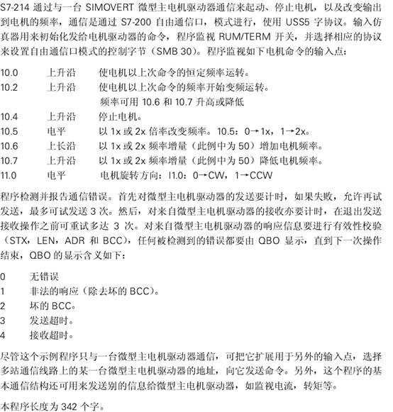 S7-214通過與一臺SIMOVERT微型主電機驅(qū)動器通信來起動,停止電機,以及改變輸出到電機的頻率。通信是通過S7-200自由通信口模式進行,使用USS5字協(xié)議。輸入仿真器用來初始化發(fā)給電機馭動器的命令。