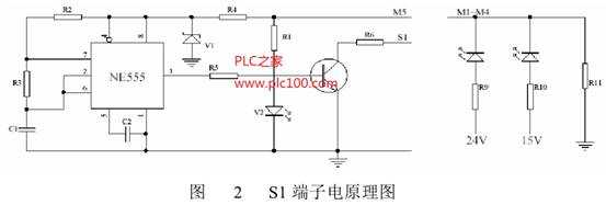 注:郵件分揀機實驗板的輸入端子為一特殊設(shè)計的端子,其原畫圖如圖2所示,它的功能是:當(dāng)輸出端MS為ON時,S1自動產(chǎn)生脈沖信號模擬測量電動機轉(zhuǎn)速光碼盤信號。