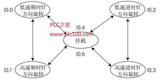 當與各輸入點相連的點動開關被按下時,電動機起動。小論電動機沿什么方向旋轉,任何時候都可以改變電動機的轉速,轉速分高低兩檔。電動機需要5秒鐘時問來剎車停機之后,才可以朝相反的方向起動。與輸出點Q0.5相連的信號燈閃爍表示電動機正處于剎車狀態(tài)。