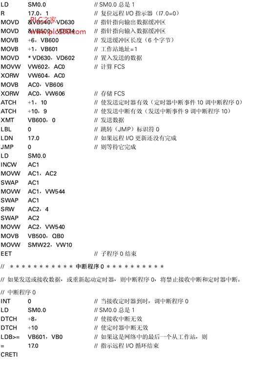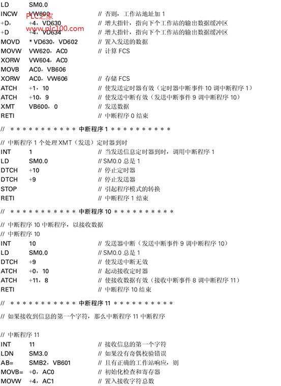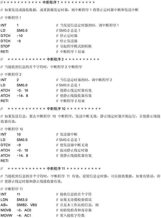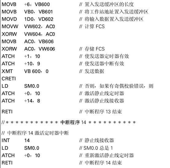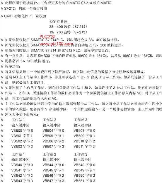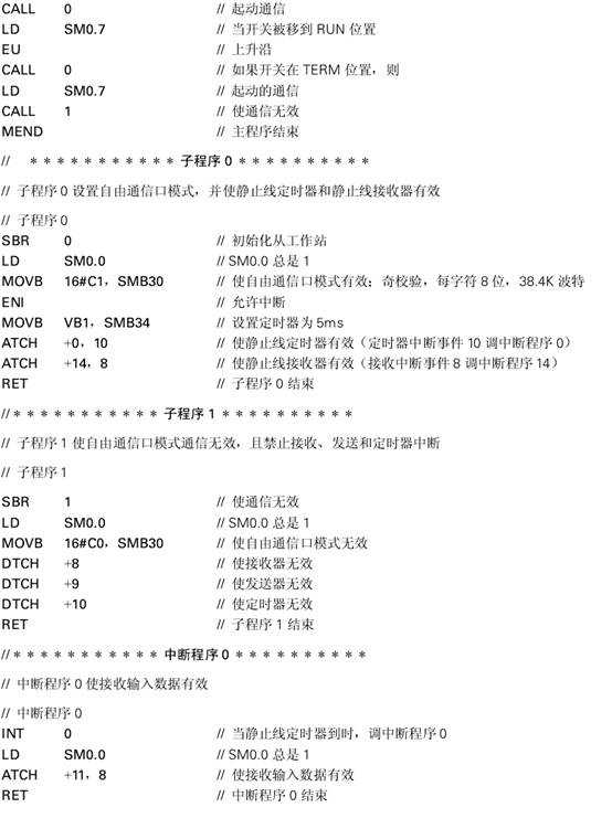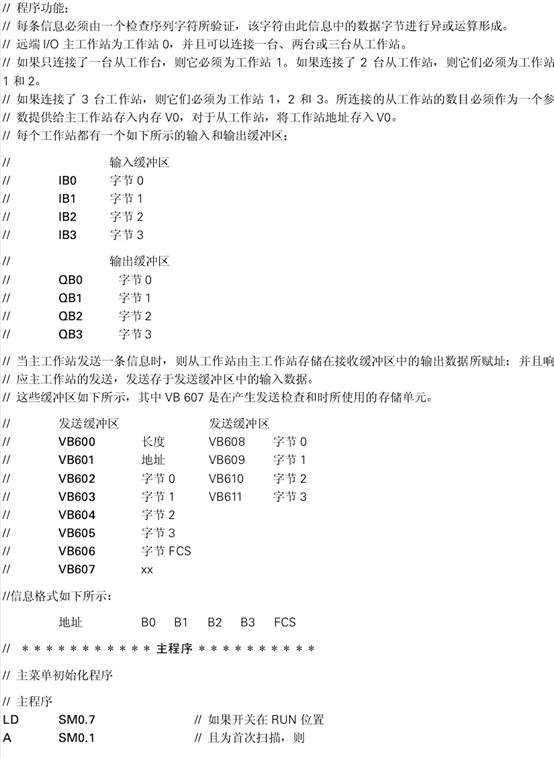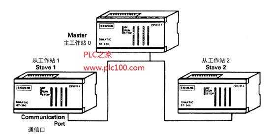 在這個例子中連接了三臺SIMATIC S7-214CPU。工作站0被稱為主工作站(Master)與工作站1和2相連,而工作站1和2被稱為從工作站(Slave)。主工作站輪流發(fā)送四個字節(jié)的輸出數(shù)據(jù)到每個從工作站。隨之每個從工作站響應(yīng)產(chǎn)生四個字節(jié)的輸入數(shù)據(jù)。自由通信口模式(Freeport Mode)被用來進行數(shù)據(jù)傳輸。