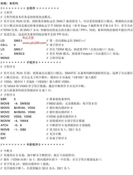從條形碼解碼器傳出的信息是ASCII碼形式,所接收的條形碼存在SIMATIC內(nèi)存中。這些數(shù)據(jù)可被程序利用,但本例中僅僅將信息存入接收緩沖區(qū),可以用SIMATIC S7-200程序包來查看。