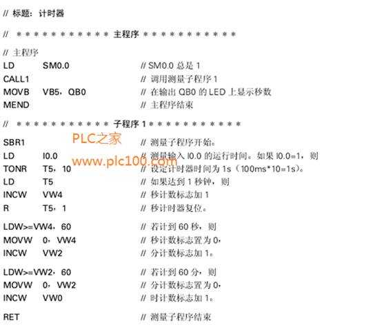 程序第一個掃描周期調(diào)用子程序1。在子程序1中,設(shè)定計時器丁5為1秒的運行時間,當達到1秒時,計時器位“T5”被置1,同時,秒計數(shù)標志VW4增加1,并將計時器位“T5”復位。因此,計時器能在下一周期立即重新啟動。