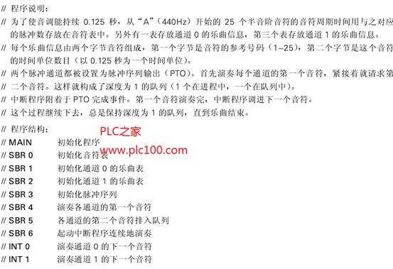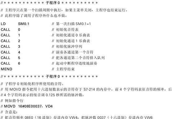 這個應(yīng)用例子展示怎樣利用S7-214 DC/DC/DC PLC的脈沖輸出功能演奏音樂。為了使音調(diào)能持續(xù)0.125秒,25個音符周期時問用與之對應(yīng)的脈沖數(shù)存放在音符表中。因為是同時演奏2個音符,所以另有兩個樂曲表格為通道0和通道1存儲樂曲信息。