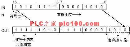 1.當使能輸入端EN = 1時,執(zhí)行整數(shù)右移指令。將來自輸入端IN的16位整數(shù)右移N位后,由OUT端輸出。