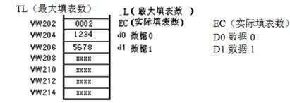 填表指令應(yīng)用舉例。將VW100中的數(shù)據(jù)1111,填入首地址是VW200的數(shù)據(jù)表中(圖1)。程序及運(yùn)行結(jié)果如圖2所示。