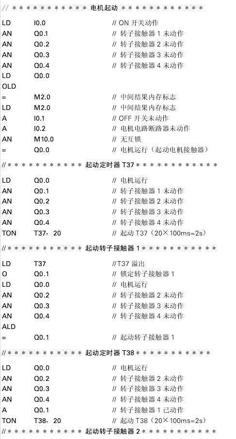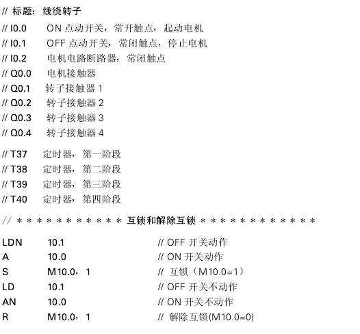 這個示例程序說明了4級線繞轉(zhuǎn)子三相異步電動機的自動起動過程。電動機起動時轉(zhuǎn)子為滿電阻。經(jīng)過一定時問后,第一個轉(zhuǎn)子觸點閉合并短接部分轉(zhuǎn)子電阻。又經(jīng)過一定時問后,后續(xù)觸點逐步受到控制,而轉(zhuǎn)子電阻每次都減小自至其完全短接,最終電動機以額定轉(zhuǎn)速運行。