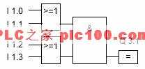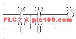例3.1.7:當(dāng)輸入信號I 1.0 和I 1.1 都為“1”,或輸入信號I 1.2 和 I 1.3 都為“1”時(shí),輸出信號Q 3.1 為“1”。否則輸出信號Q 3.1 為“0”。
