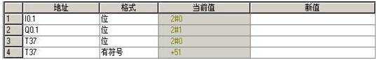 可以使用狀態(tài)表來監(jiān)控用戶程序,還可以采用強(qiáng)制表操作修改用戶程序的變量。編程軟件使用示例的狀態(tài)表監(jiān)控如圖3所示,在當(dāng)前值欄目中顯示了各元件的狀態(tài)和數(shù)值大小。