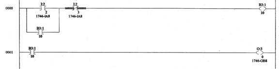 The ladder logic program in Figure 3.1 is an output latch control. Each of the input terminals I:2/2 and I:2/3 is connected to a normally-open, momentarily-closed push button. A normally- open, momentarily-closed push button is a control component, whose contacts are open when the button is not pushed. Its contacts are closed when the button is pushed. The output terminal O:3/0 is connected to the device being controlled, e.g. a motor starter, a heater, a light, or similar device. The push button connected to the input terminal I:2/2 is a START button. When this button is pressed and the button connected to the input terminal I:2/3 is not pressed, the PLC finds a true path made by the Examine-if-Closed instruction I:2/2 and the Examine-if-Open instruction I:2/3. So the Output Energize instruction O:3/0 is true now and its memory is updated. This memory updating causes the Examine-if-Closed instruction O:3/0 to be true. Now, releasing the START button does not cause the Output Energize instruction O:3/0 to turn to false, because there is another true path made by the Examine-if-Closed instruction O:3/0 and the Examine-if-Open instruction I:2/3. The push button connected to the input terminal I:2/3 is a STOP button. When this button is pressed, the Examine-if-Open instruction I:2/3 is false. That will cut off the true path to the Output Energize instruction O:3/0 and de-energize the output.