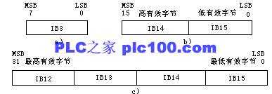 (4)“雙字”存取方式:相鄰的四個字節(jié)表示一個雙字,四個字節(jié)的地址必須連續(xù)。最低位字節(jié)在一個雙字中應(yīng)該是最高8位。ID12表示由IB12~IB15組成的雙字,I為區(qū)域標識符,D表示存取雙字(Double Word),12為起始字節(jié)的地址。ID12中的IB12應(yīng)該是最高8位,IB15應(yīng)該是最低8位。如圖: