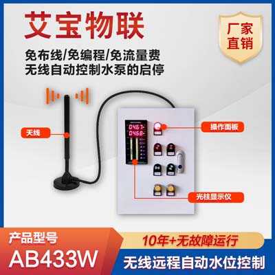 AB433W具有無線自動水位顯示及控制功能,支持太陽能電源供電,光電隔離輸入直接接浮球開關(guān),繼電器輸出。發(fā)送端停電的情況下,接收端自動斷開,增加系統(tǒng)的可靠性??蓪⑺恍畔o線傳輸?shù)奖谜?,泵站的無線模塊根據(jù)水位狀態(tài)自動控制水泵的啟停。可以工作在點對點模式:一個水池和一個泵站;也可以工作在點對多模式:多個水池和泵站之間無線自動控制。AB433W無線終端采用無線電數(shù)字加密通信技術(shù),抗干擾能力強,可替代電纜,無需挖溝布線,大大降低企業(yè)人力物力成本,減少施工和維護難度。![]() 發(fā)射端:上水位輸入接水位上限浮球開關(guān);下水位輸入接水位下限浮球開關(guān)。 接收端:繼電器1代表無線通信狀態(tài),當(dāng)通信正常時繼電器1閉合,當(dāng)超過10秒(默認(rèn)10秒,可在出廠時更改)沒有收到發(fā)射端的數(shù)據(jù),繼電器1斷開;繼電器2根據(jù)上下水位狀態(tài)而改變。建議繼電器1和繼電器2串聯(lián)使用,這樣當(dāng)發(fā)射端斷電的情況下,水泵自動關(guān)閉。 AB433W無線水位自動控制器,主要是針對遠距離的水塔、山頂蓄水池及江河水位監(jiān)測而設(shè)計的全自動無線電測控系統(tǒng)??筛鶕?jù)用戶需求自由配置。針對工業(yè)用戶,全工業(yè)級防雷設(shè)計,久經(jīng)工業(yè)現(xiàn)場考驗,質(zhì)量穩(wěn)定可靠。免編程,撥碼開關(guān)即可設(shè)置所有工作參數(shù)。產(chǎn)品體積小巧,標(biāo)準(zhǔn)導(dǎo)軌安裝。廣泛應(yīng)用于工業(yè)自動化、廠礦、電力、水利、環(huán)保、農(nóng)業(yè)等領(lǐng)域。 |
