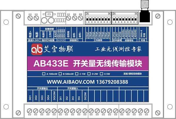 | 例如訂購型號AB433E1D表示:發(fā)送模塊4DI+4DO,接收模塊4DI+4DO;無線功率2W,傳輸距離5km。 |