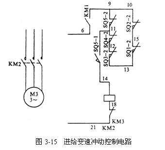 條件:先起動(dòng)主軸電動(dòng)機(jī)M1,使接觸器KM1吸合,它在進(jìn)給變速?zèng)_動(dòng)控制電路中的常開(kāi)觸點(diǎn)(6-9)閉合。