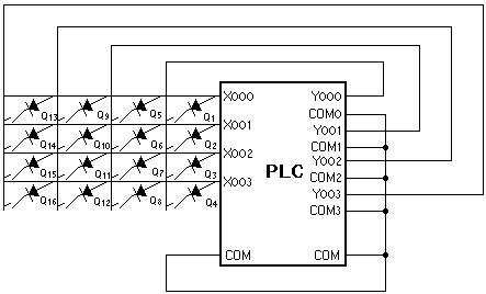 (2)矩陣輸入 如圖2所示為4×4矩陣輸入電路,它使用PLC的四個輸入點(X000~X003)和四個輸出點(Y000~Y003)來實現(xiàn)16個輸入點的功能,特別適合PLC輸出點多而輸入點不夠的場合。當Y000導通時,X000~X003接受的是Q1~Q4送來的輸入信號;當Y001導通時,X000~X003接受的是Q5~Q8送來的輸入信號;當Y002導通時,X000~X003接受的是Q9~Q12送來的輸入信號;當Y003 導通時,X000~X003接受的是Q13~Q16送來的輸入信號。將Y000的常開點與X000~X003串聯(lián)即為輸入信號Q1~Q4;將Y1的常開點與X000~X003串聯(lián)即為輸入信號Q5~Q8;將Y002的常開點與X000~X003串聯(lián)即為輸入信號Q9~Q12;將Y003的常開點與X000~X003串聯(lián)即為輸入信號Q13~Q16。